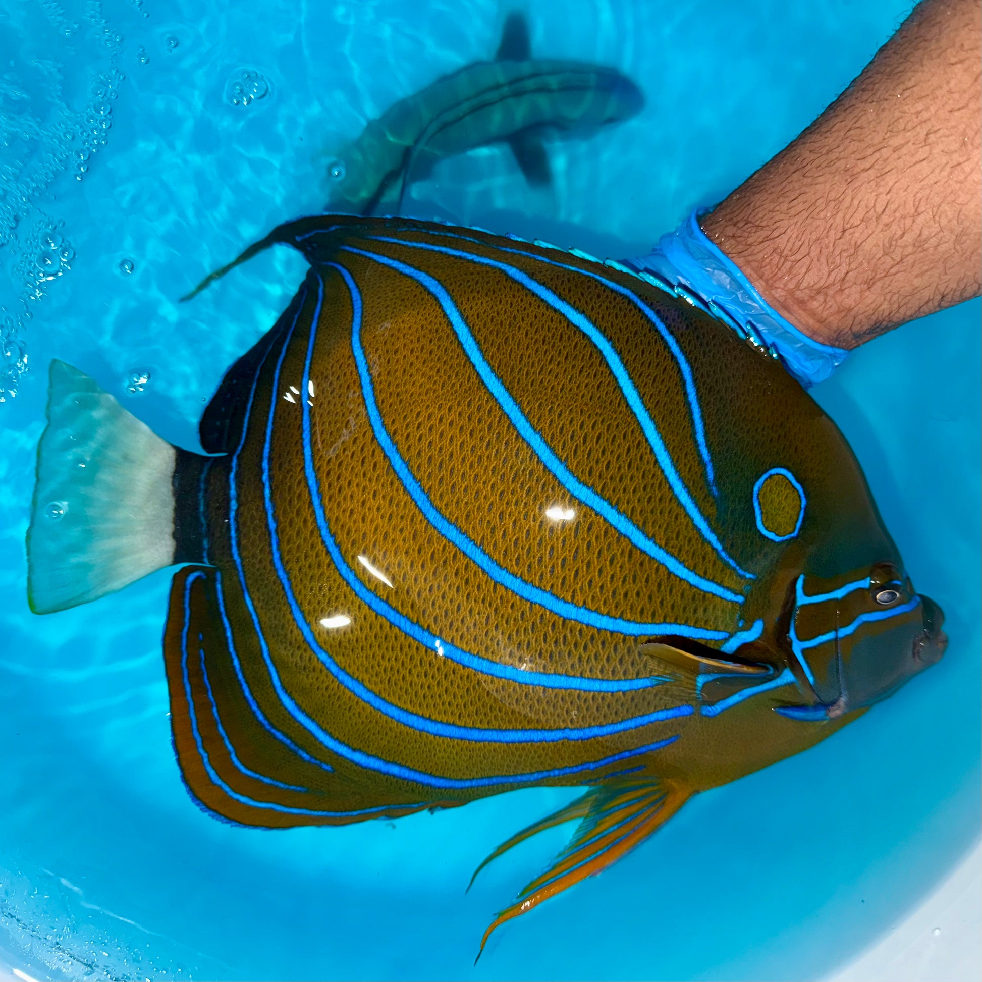 Also referred to as the blue ring angel, is a strikingly beautiful fish with its vivid neon sapphire lines across the body. This angelfish is one of the shy angels and needs plenty of hiding places for it to adjust to your aquarium.