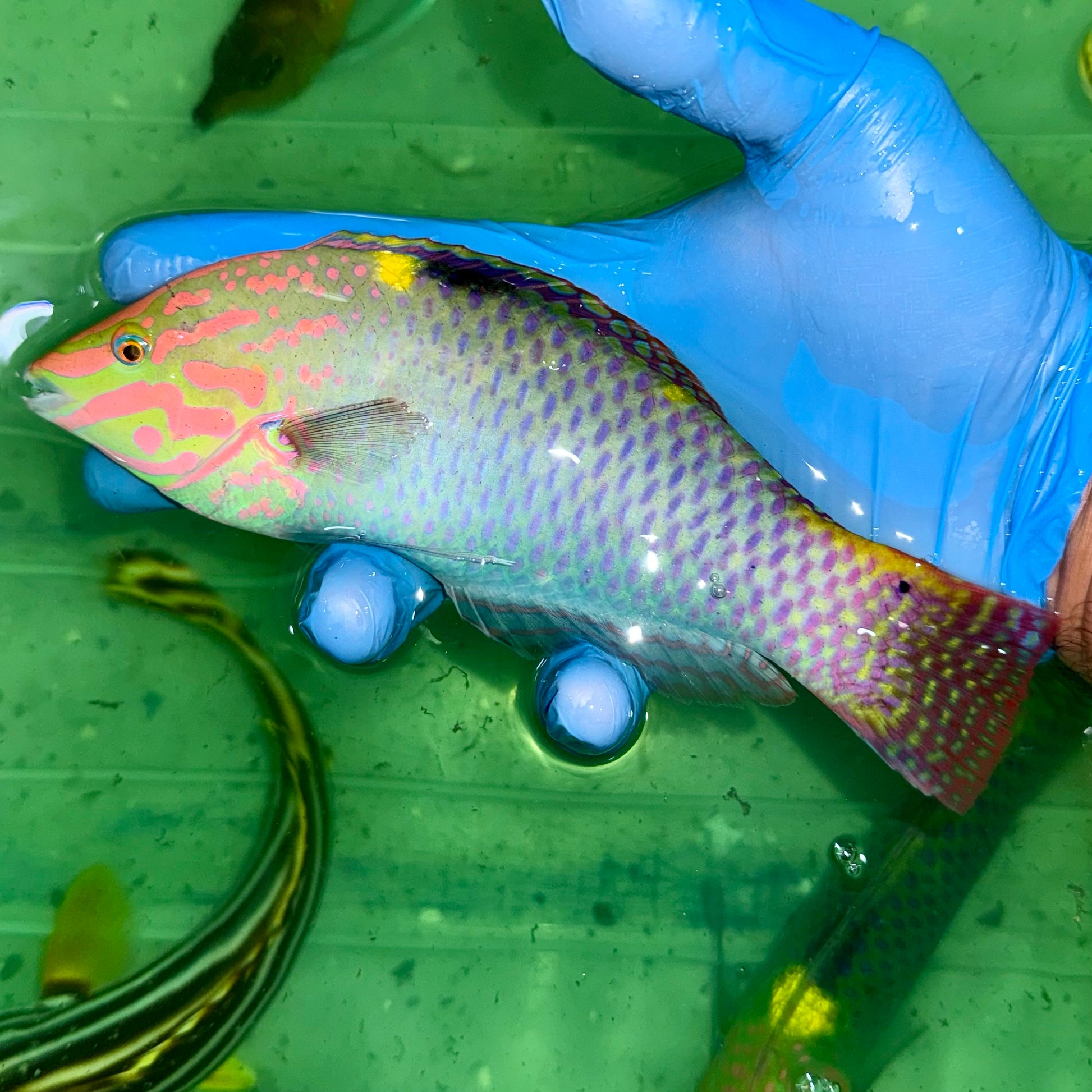 About Checkerboard wrasse super male 7-8” (Halichoeres hortulanus)