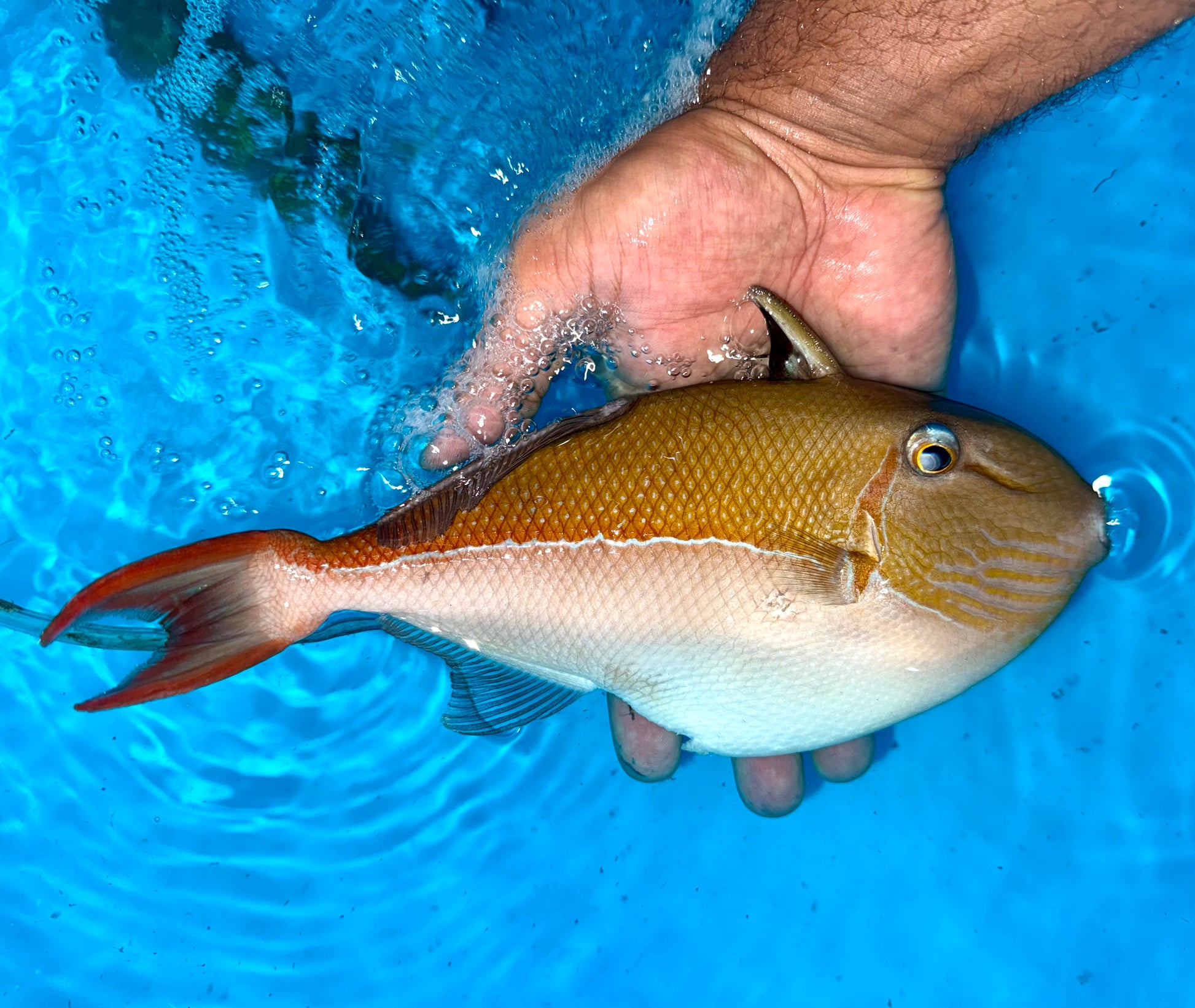 About Golden Back Trigger Male 9-10” (Xanthichthys caeruleolineatus)