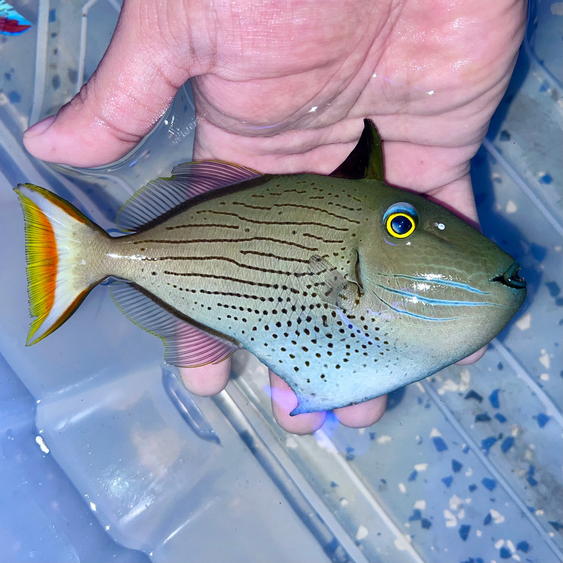 The Line Spot Trigger is a striking and uncommon reef-safe fish, distinguished by its grey-silver body adorned with intricate lines and spots, culminating in a vibrant orange tail.
