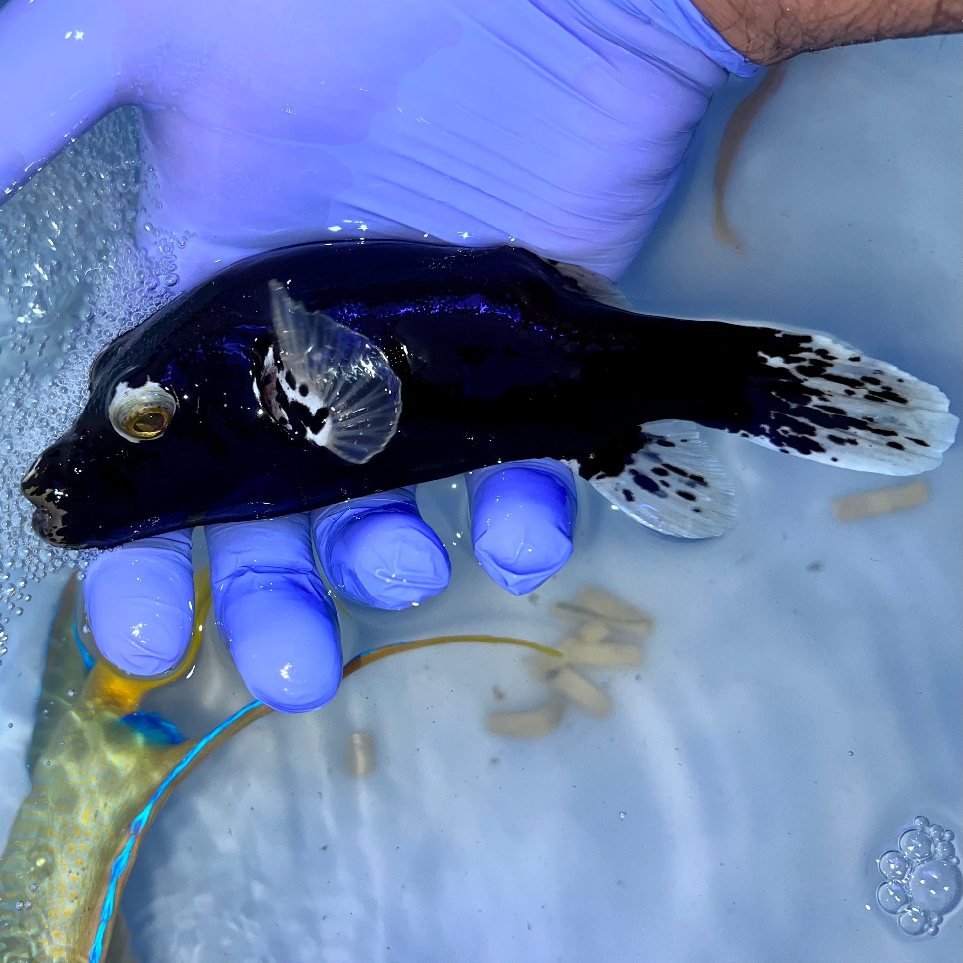 The midnight black puffer stands out with its striking jet-black color and velvet-like appearance, making it a unique addition to any aquarium. Like other puffers, it has the tendency to puff itself up when feeling stressed or threatened. To maintain its dental health, it needs a diet rich in meaty foods such as clams and mussels.