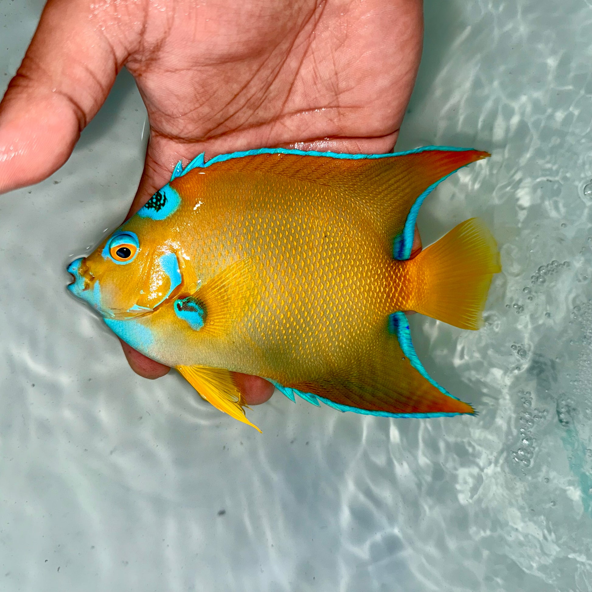 The Queen Angelfish is one of the most striking members of the Angelfish family, known for its vibrant yellow and blue coloration, accented with electric sapphire-blue features that give it a radiant appearance.
